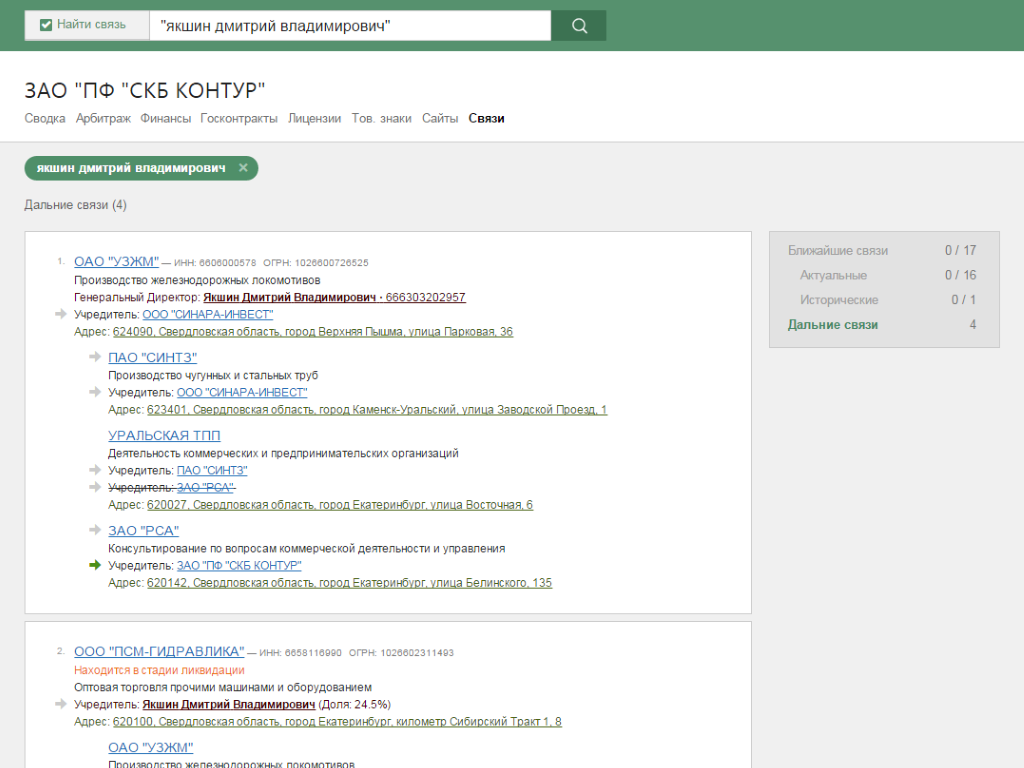 В «дальних связях» можно посмотреть список организаций, потенциальная связь с которыми найдена через одно или несколько других юридических лиц.